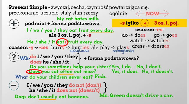 Przyjrzyj się jeszcze raz jak tworzymy present simple, a następnie wykonaj ćwiczenia w quizie.